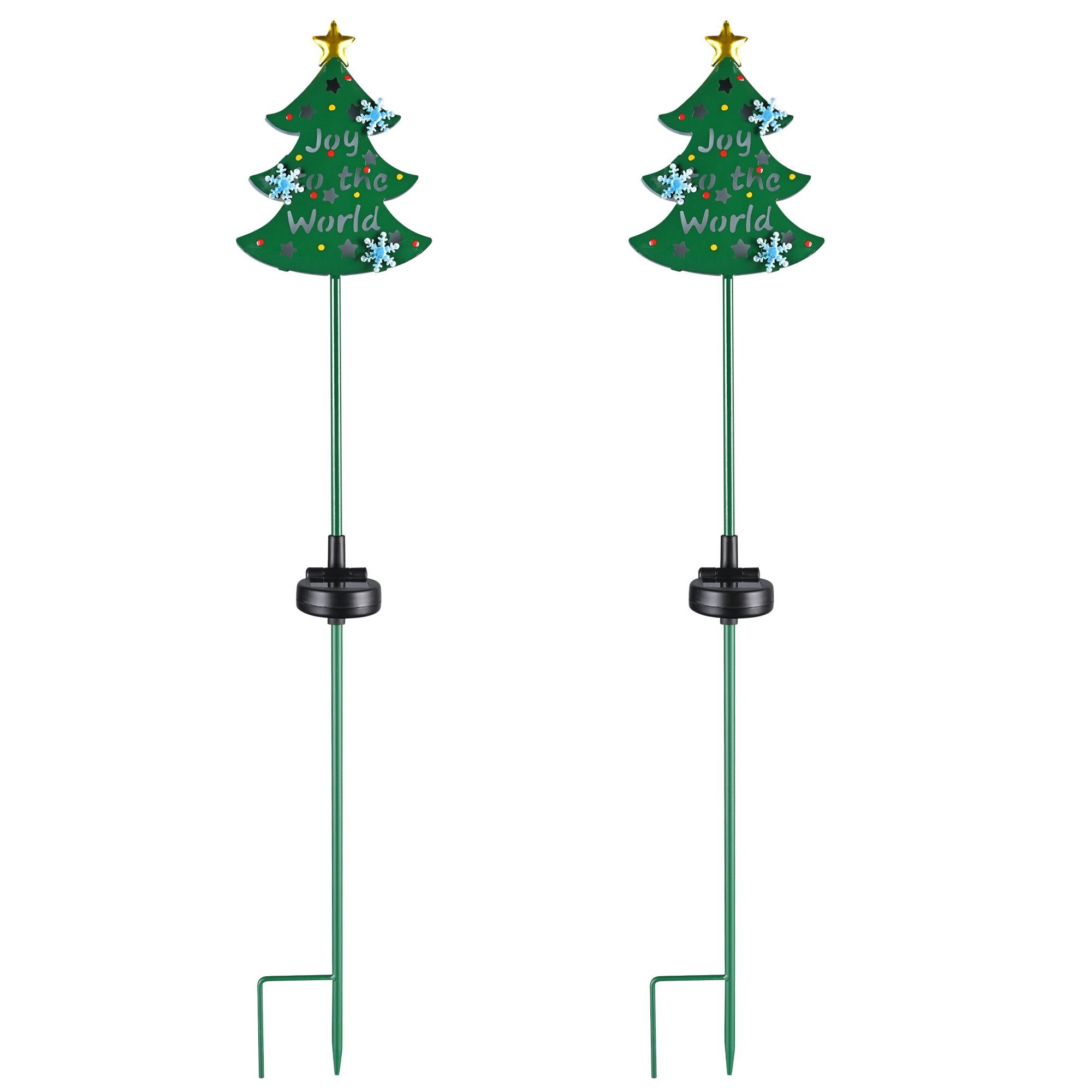 - Unique Christmas Decoration - 2 pcs 6"x4"x33" Solar Stake Lights feature Christmas tree dotted with snowflakes & gold star at the top; with interior green LED light to highlight Joy to the World; enhance festival atmosphere & fit your garden; backyard; lawn; pathway; patio; perfect for Christmas; wedding; party decoration